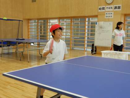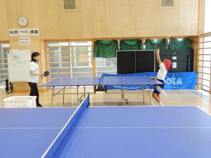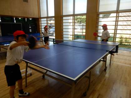 体育の先生と卓球をしています。ゲーム感覚で楽しく体を動かしています。