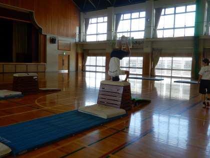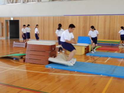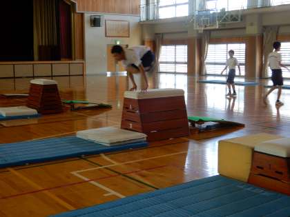 目標には「跳び箱運動では、切り返し系や回転系の基本的な技を滑らかに行うこと、条件を変えた技や発展技を行うこと」とあります。個人の能力に分かれて行っています。