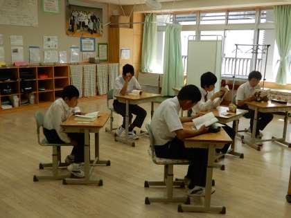 1年生から9年生までが集中して読書しています。
