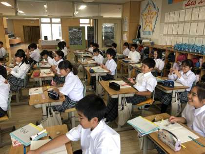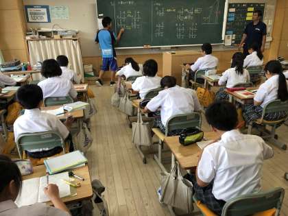 5年生は、少数のかけ算に取り組んでいます。真剣に取り組みながらも、先生のユーモアあふれる問いかけに、クラスが一瞬和んだ瞬間です。