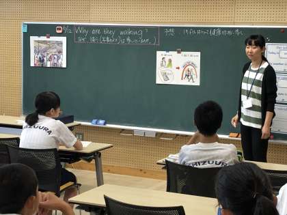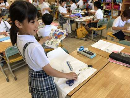 疑問が英語で出ている8Aです。「Why are they walking?」に向かって単語を調べたり文法を考えたりしています。「社会科見学で学んだことを新聞でまとめたい」という4年生。内容をよりよくしようと話し合ったり丁寧に書いたりしています。