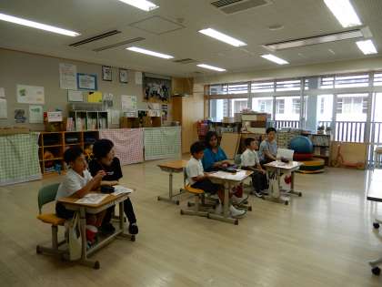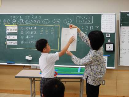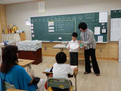 生活単元の授業です。自分ができるようになったことをみんなの前で発表しています。けんだま、おてだま、ホッケーなどできるようになったことの振り返りも立派に発表できました。