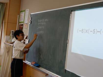 加減乗除の混じった計算の学習です。計算の手順をしっかり理解すると早く確実で正確に解けるようになります。黒板で書いてくれた子の手順をみんなで話し合っています。