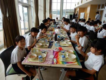 4Aと7Bの交流給食です。美味しい給食を食べています。本日は七夕メニューです。