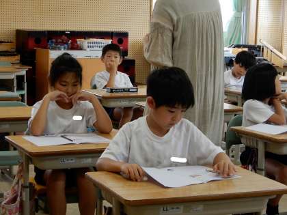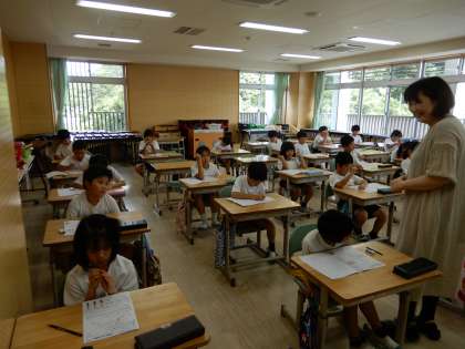 1学期の音楽の授業の振り返りをしています。歌った曲名は、いくつか書けたかな。糸川先生が、系統的に音楽の授業をつないでいます。