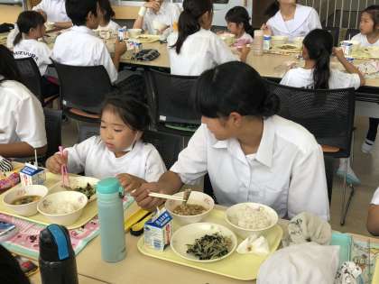 お兄さん、お姉さんとお話をしながら楽しく給食を食べています。