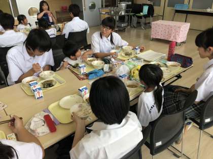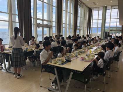 お兄さん、お姉さんとお話をしながら楽しく給食を食べています。