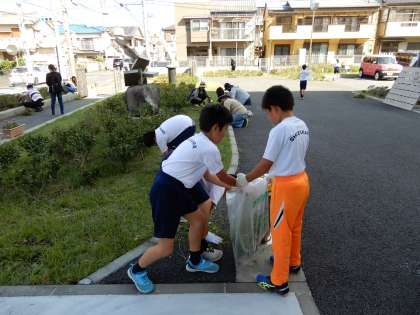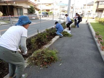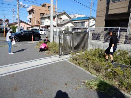 北側駐車場付近は5、6年生と保護者の皆様です。植え込みの草を丁寧に取ってくれています。ありがとうございます。