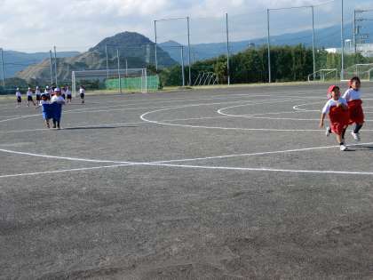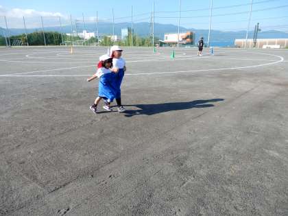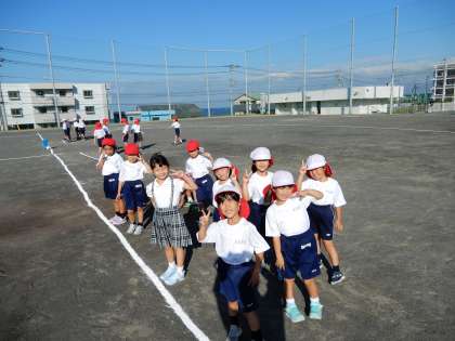 初志部種目の1年生の様子です。紅白に分かれてデカパンリレーです。デカパンを交代するときに素早く行うかが大切です。
