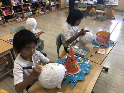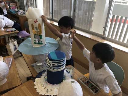 2Aの図工の時間では、すてきな帽子をかぶせる顔を制作しています。自分の作った帽子をかぶせるキャラクターを思い思いに描いています。