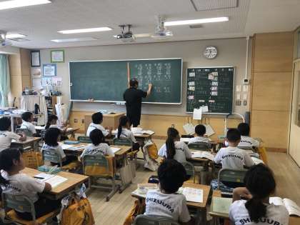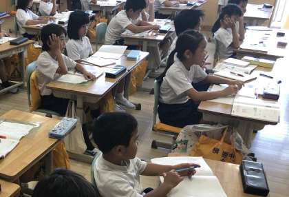 3Aの算数の時間では、かけ算の筆算を練習しています。みんなで計算の仕方を声に出して復唱しながら取り組んでいます。