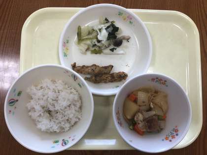本日の給食は、米飯、肉じゃが、きびなごフライ、さつま揚げと野菜の炒め物、牛乳です。おいしくいただきます。