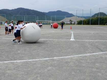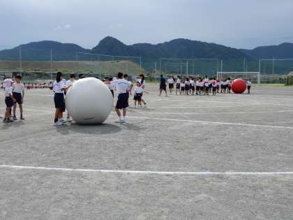 大玉種目です。1年生から9年生が紅白縦割り班で分かれ2チームで、大玉を転がしたり、頭の上をまわしたりする種目です。チームで協力しないと大玉が転がってしまいます。