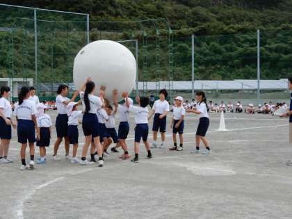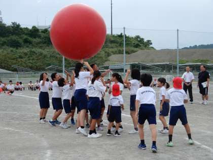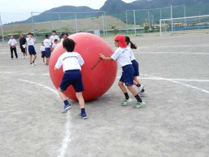 上級生が下級生と一緒に競技しています。大玉が思うように転がってくれませんね。当日も楽しみです。