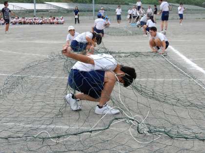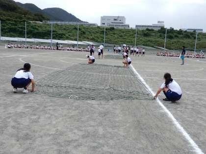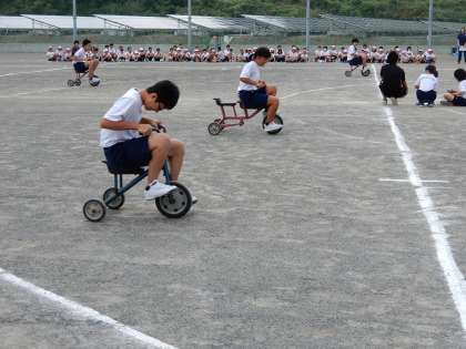 3種目目は、障害物競走です。三輪車、ネット、バット10周(立志部以上)、おたまと順に障害物を乗り越えていきます。