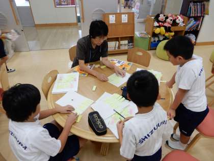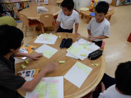 図書館で言語読解の授業です。付せんを使用して自分の考えを書き込んでいます。これから自分の意見を発表していきます。