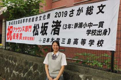 本校卒業3期生(高校3年生)ですが、全校高等学校総合文化祭のアナウンス部門で見事優勝しました。卒業生も頑張っています。おめでとうございます。今後の活躍も期待しております。