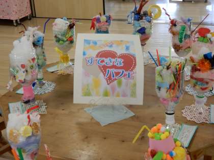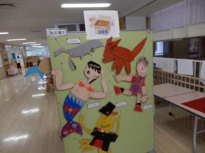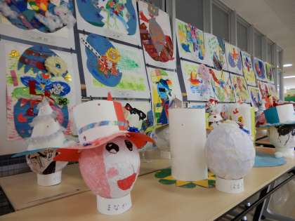 黒潮祭文化の部(展示の部)の様子です。1A素敵なパフェ 2A秘密の卵 3A動くダンボール人形 子供たちが一生懸命制作した作品です。