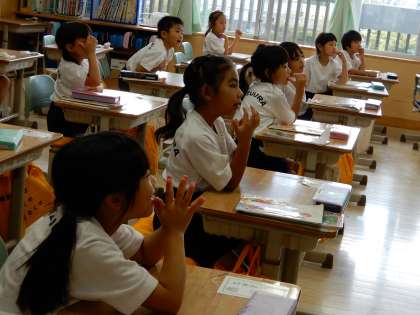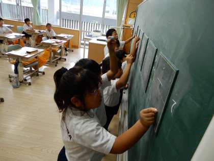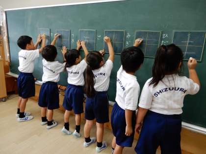 漢字の学習です。1年生では80個の漢字を習います。本時は「手」「左」「右」「五」「月」「出」書き順も含めて黒板で確認しています。