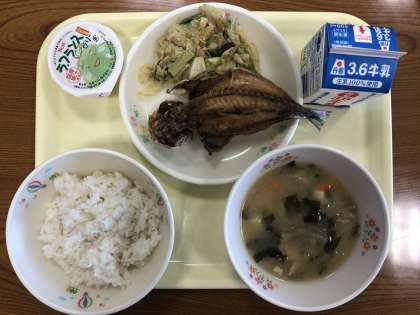 本日の給食は、米飯、牛乳、アジの干物、ゴマ和え、ジャガイモとわかめの味噌汁、デザートです。おいしくいただきました。