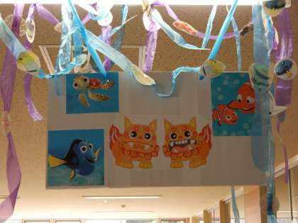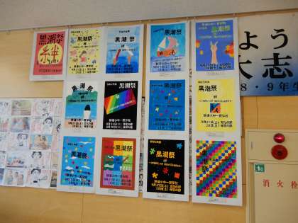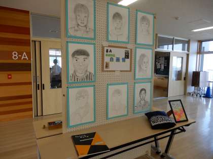 大志部のコモンスペースです。沖縄修学旅行コーナー、黒潮祭ポスター、書写、自由研究作品、美術の自画像などの作品があります。明日は、1〜9年までの作品が校舎内に展示されます。例年より昼の時間を長くしましたので、ゆっくりご覧ください。