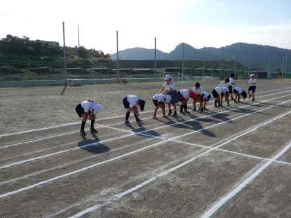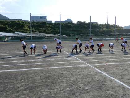 4年生も大グラウンドで、初志部種目の練習で、馬跳びを紅白に分かれて練習しています。