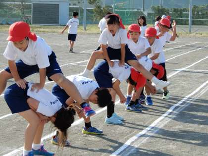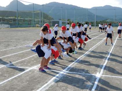4年生、赤組の馬跳びの様子です。初志部種目のアンカーは4年生になります。チーム初志部で頑張ってください。