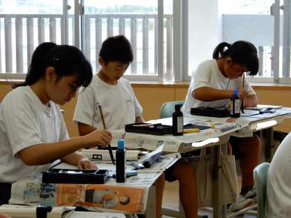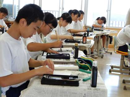 書写の授業です。「理想は高く」集中して書いていきます。