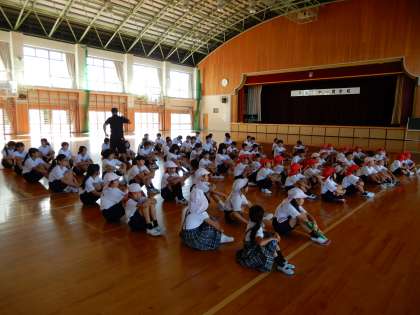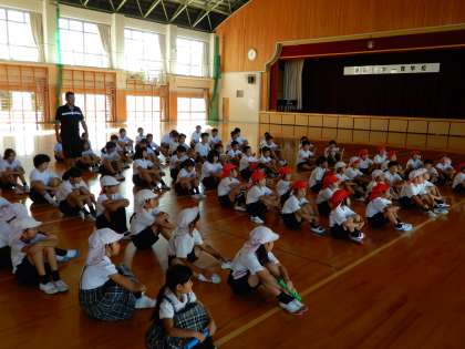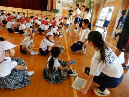 黒潮祭体育の部の選抜リレー(1〜9年)の並び方を体育館で確認しています。9学年で順にバトンを渡していきます。一貫校ならではの見応えのあるリレーです。