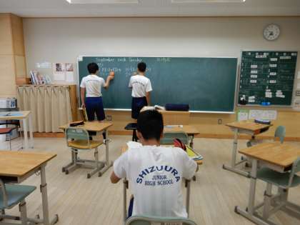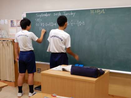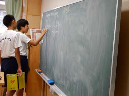 一次方程式の学習です。黒板で分数が入った一次方程式の問題を解いています。頑張っています。