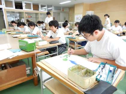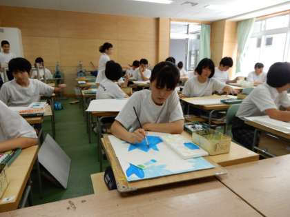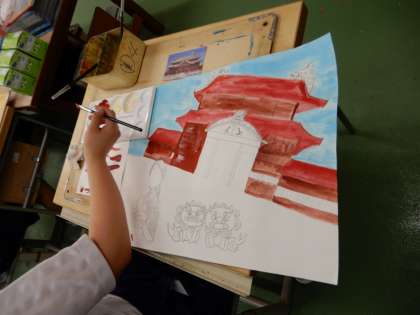 沖縄修学旅行の想い出を絵に描いています。ジンベイザメや首里城、シーサーなどが描かれています。完成が楽しみです。