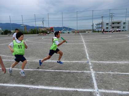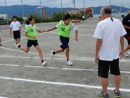 紅白各2チームが走っていますが、初めてのバトンパスなので呼吸を合わせることが大切です。