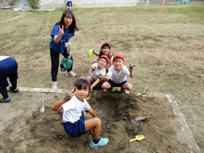 初志部の子供たちは、鬼ごっこや遊具で遊んでいます。砂場では、どろ遊び水をたくさん入れて楽しそうです。