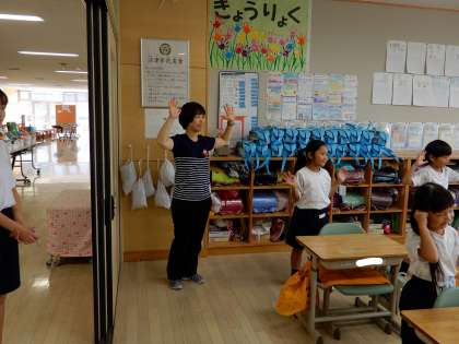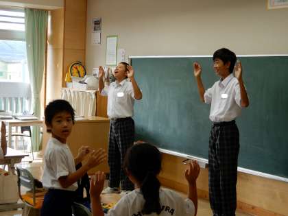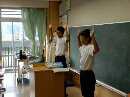 朝の会で紅白応援団員が、初志部の学級で応援指導です。気合いの入った良い声が聞こえてきます。