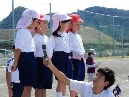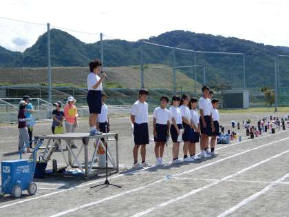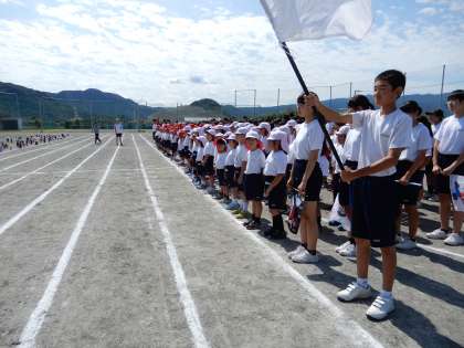 自治会長の石原君が学校旗を先頭に入場しました。開会式の流れも確認しました。1年生による運動会のめあてです。