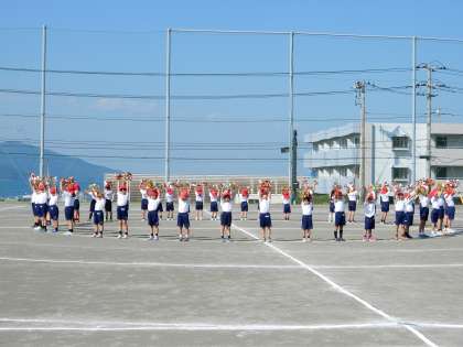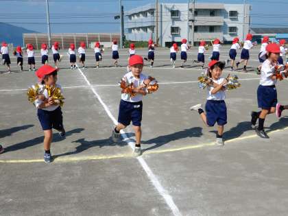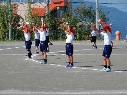 1、2年生の表現「ありがとう 友よ」です。1、2年生がボンボンを持って踊ります。たいへんかわいいです。