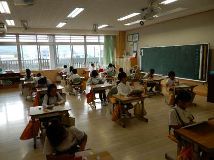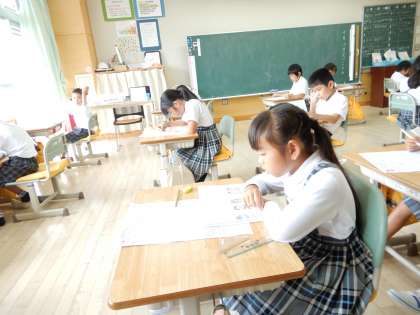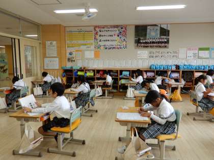 三角形と四角形の単元テストを実施しています。終わった子は静かに読書の時間です。