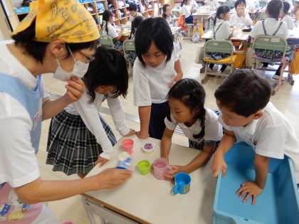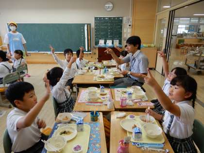 初志部長の河村先生が、2Aで給食を食べています。みんな楽しくいただいています。栄養士の金指先生もいつも見に来てくれています。牛乳は人数分をコップに分ける、デザートは45分までに食べ終わった子で食べたい子がジャンケンをして決める。などルールがあります。いつも栄養のバランスを考えた、美味しい給食をありがとうございます。