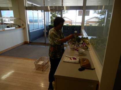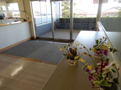 地域にお住まいの方が、ボランティアで玄関に素敵な花瓶で花を活けてくれています。ありがとうございます。