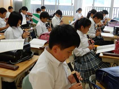 帰りの会の様子です。司会も自分たちで行い、帰りの歌も5、6年生はリコーダーを上手に吹いています。
