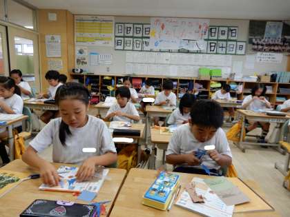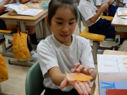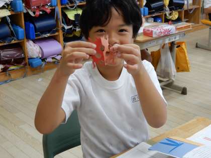 昆虫について学習していきます。教科書から昆虫を切り取っています。テントウ虫やカマキリ、カブトムシなどが切り取られ、子供たちは大喜びです。