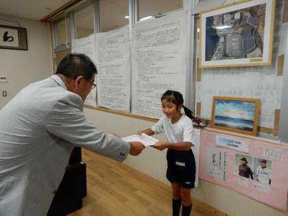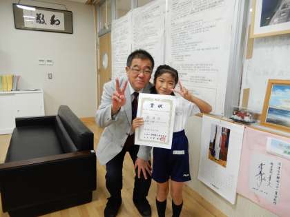 陸上の大会で、2年生の子供が、50m走で八位入賞したので表彰しました。おめでとうございます。