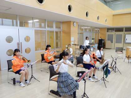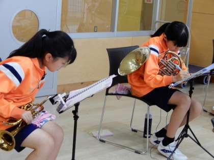 吹奏楽部です。黒潮ホールで7年生のみですが、お互いに課題をメモしたり話し合ったりしながら演奏を磨いています。