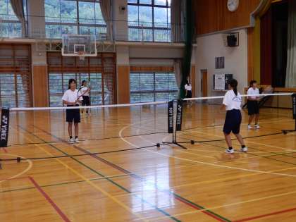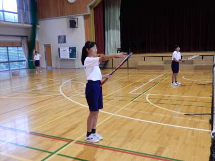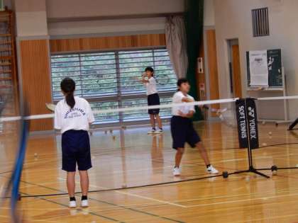ソフトテニス部です。体育館半面を利用して基礎・基本練習を繰り返ししています。