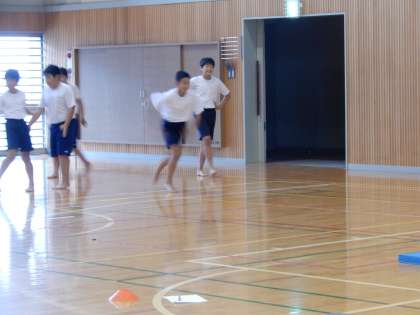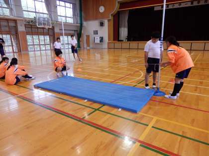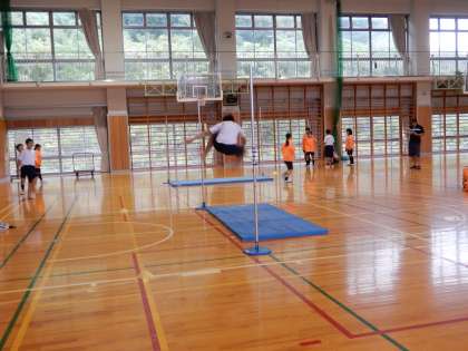 体育館で高飛びの授業です。発達段階に分かれて練習しています。みんな意欲的に練習しています。