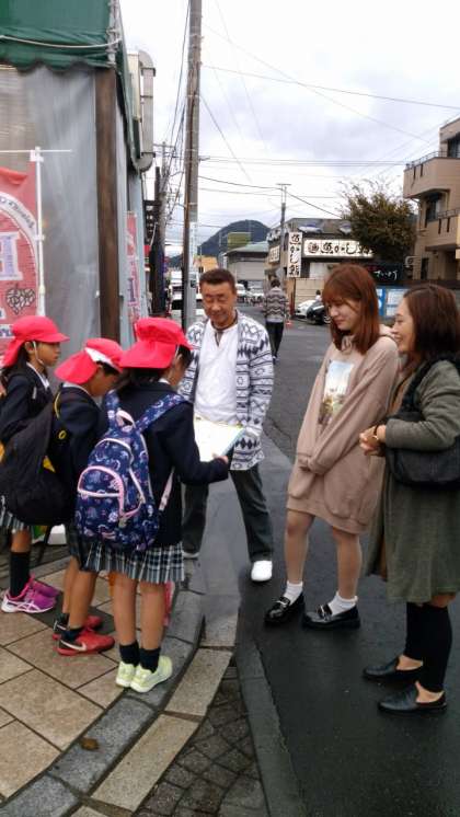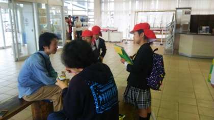 観光客にもインタビューしています。県外からのお客様が多く、ほとんどの方がリピーターの方でした。また、海鮮の美味しさを絶賛されていました。インタビューした方から「インタビューの仕方が上手だね」ともめていただきました。4年生学習成果が現れいます。