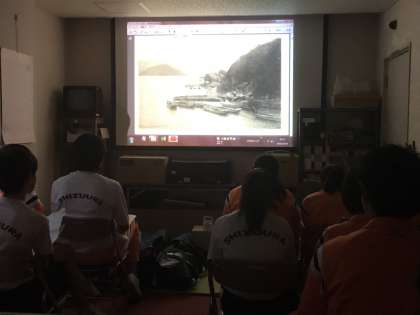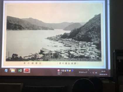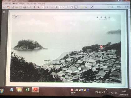 次の学習は、絵はがきに見る静浦の歴史です。西郷島、布島の位置から現在の静浦のどの辺りかを推定していきます。獅子浜や多比で行われていた漁業、急深な江浦湾に停泊する洋式の船舶など、地形を効果的に活用していた様子を理解しながら現在の静浦を比較していく学習はたいへん興味深いものでした。