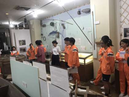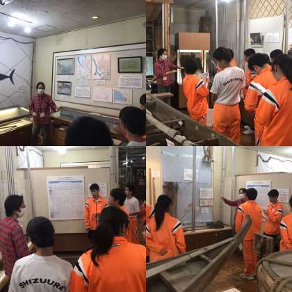 1階の展示室では、静浦の漁業について学びました。砂地の志下、馬込、獅子浜では地曳き網漁が行われていたこと、江浦、多比、口野では岩礁に網が引っかかることから建切り漁が行われていたことも、静浦のよさを最大限に活用する古人の知恵であると、改めて感動しました。