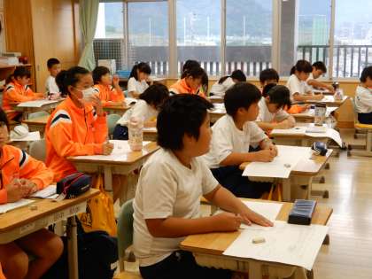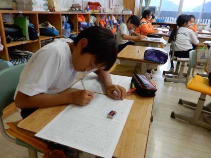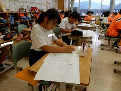 福祉の学習です。静浦地区のお年寄りを楽しませるには、どうすれば良いのか。自分たちが書き込んだシートを中心に原稿用紙にまとめています。