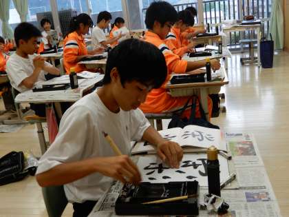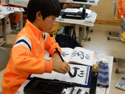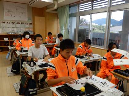書写の授業です。行書で「栄光」を書いています。集中して頑張っています。